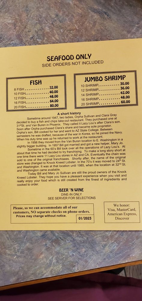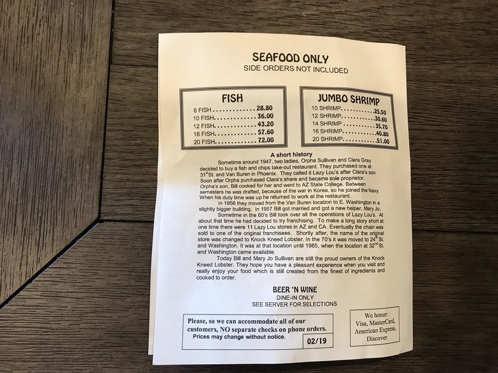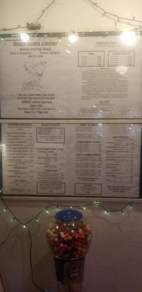 Introducing Knock Kneed Lobster, a beloved fish and chips seafood spot in Phoenix. Known for its self-serve condiments and generous portions, customers rave about the delicious meals at this casual eatery. From crispy fish and shrimp to battered mushrooms and zucchini, there's something for everyone to enjoy. The fried zucchini and mushrooms are particularly popular, with customers praising the thick slices and flavorful batter. Knock Kneed Lobster is a go-to for traditional fish and chips lovers, offering a variety of sauces and sides like broccoli. With friendly service and a cozy atmosphere, this restaurant is perfect for groups, families, and seafood enthusiasts alike. Don't miss out on the best fish and chips in Phoenix at Knock Kneed Lobster!